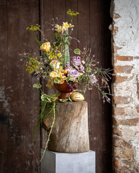 Fall embraces bold contrasts and sculptural elegance with rich color, layered textures, and earthy tones. Featuring standout roses like Free Spirit, Aloha, Brave in Dark, and Exotix Berry, this trend pairs florals with raw, decorative elements for a striking, runway-inspired composition.